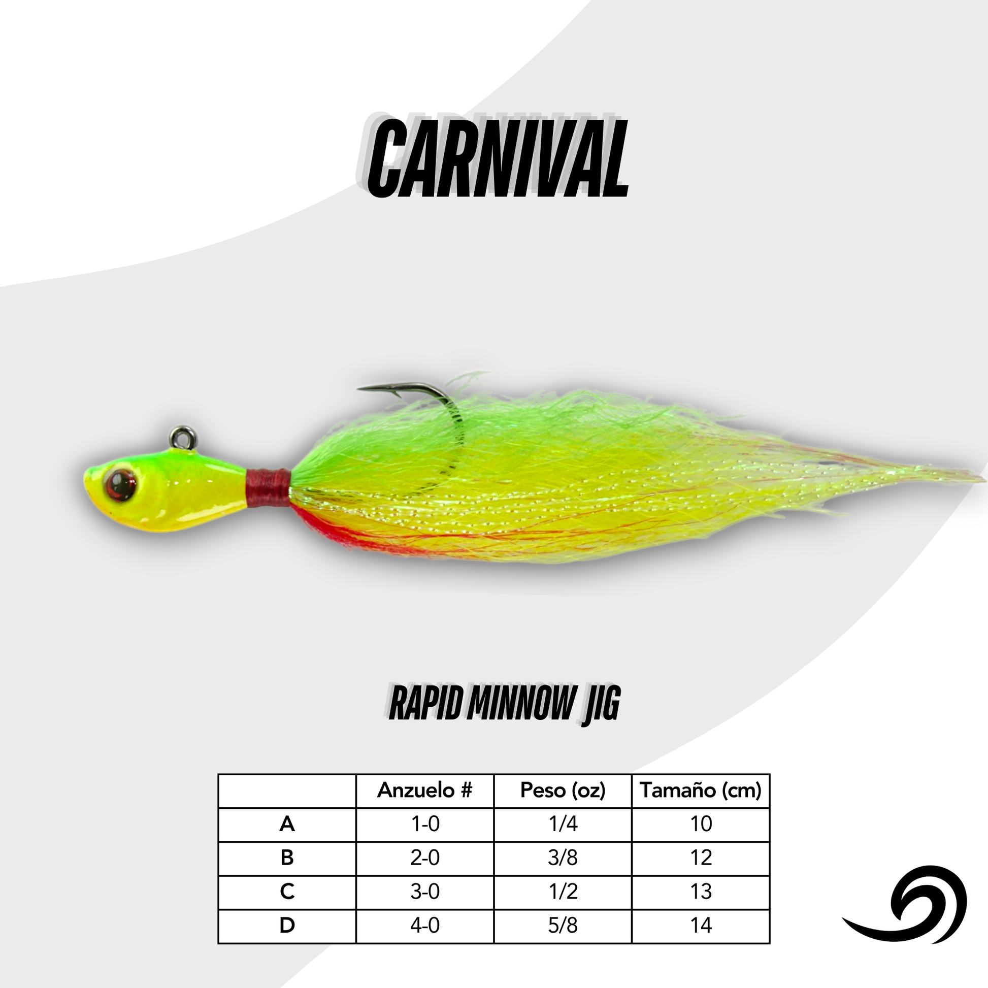 Con su diseño inspirado en el clásico Firetiger, el Carnival combina colores vivos que funcionan en cualquier condición de agua, especialmente en ríos y embalses con aguas turbias. Este jig es un favorito para el dorado y el tucunaré, ya que estimula su agresividad natural.