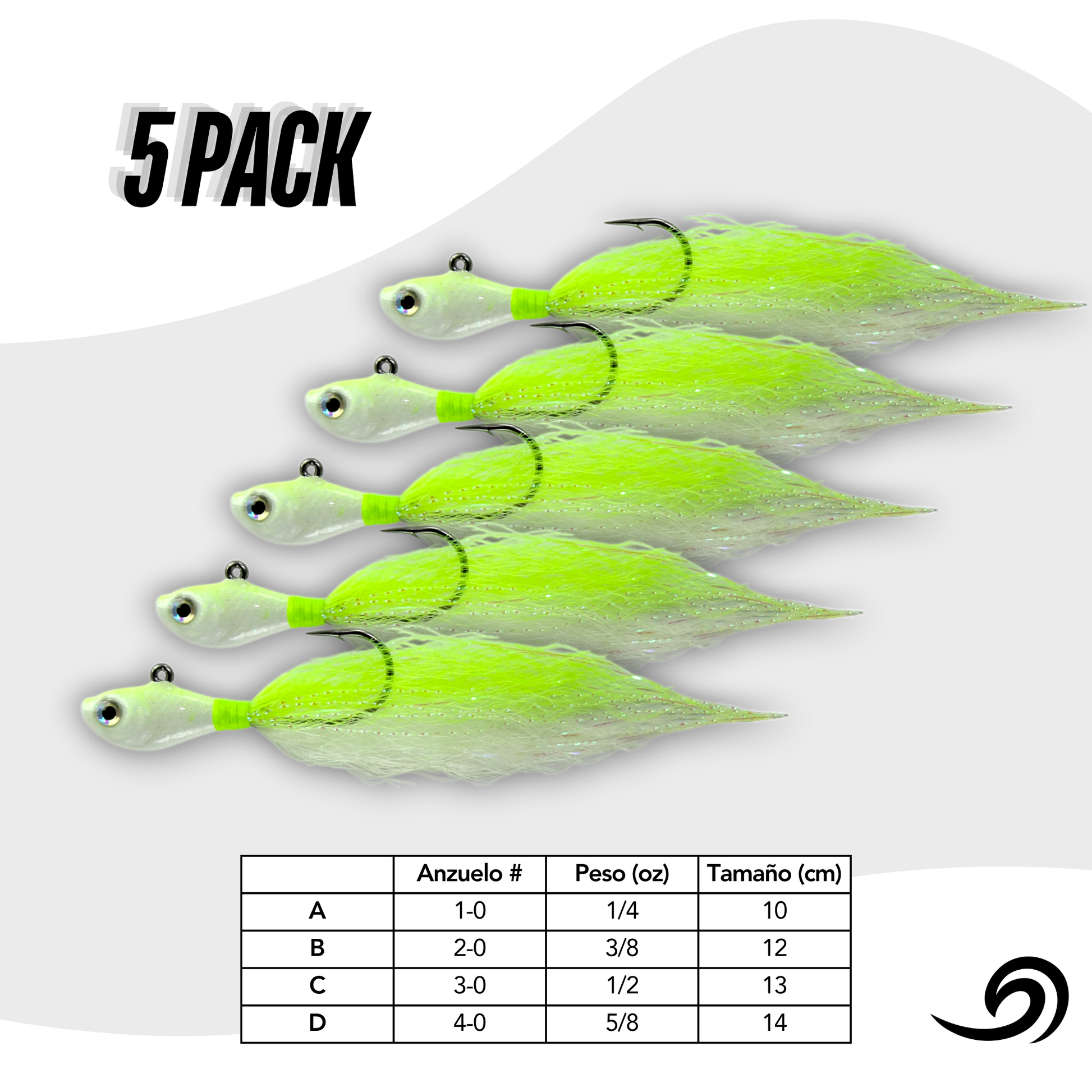 Domina aguas turbias con este pack de 5 unidades del Emerald Storm. Este jig es un favorito por su alta visibilidad y efectividad.
